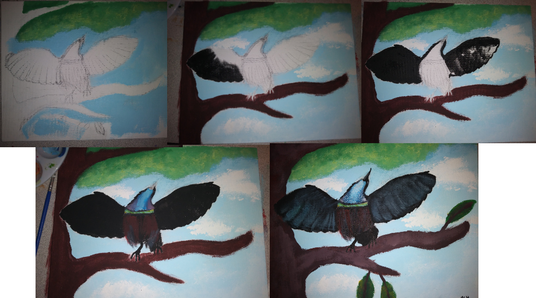 While working on this piece, I struggled to cooperate with it as I expected. Acrylics are not my strong suit but I was determined to make it work as best as I could. Changes I had to make include the shading on the feathers and the tree colors. It was quite difficult fixing the tree, again and again, hoping that maybe I would have an epiphany moment when I discovered how to texture it better. Unfortunately, this did not go as I would've liked and the colors came out incorrect. The highlights in the feather looked okay but I'm afraid I went a little over board and now it lacks shadowing.